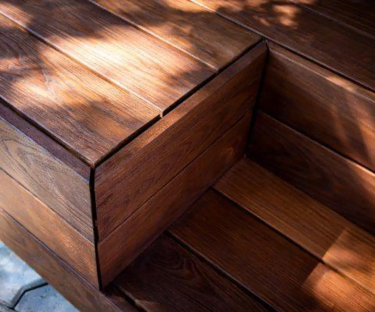 Deski tarasowe wykonane z jesionu Thermory są całkowicie odporne na warunki atmosferyczne dzięki czemu nie wymagają impregnacji.